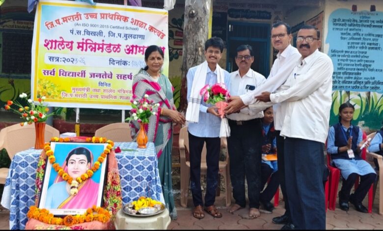 क़ासिद / शेख मुख्तार (करवंड): चिखली तालुक्यातील ISO मानांकन प्राप्त जिल्हा परिषद मराठी उच्च प्राथमिक शाळा, करवंड येथे नुकताच शाळेच्या शालेय मंत्रिमंडळ आमसभेच्या निमित्ताने शाळेचे माजी विद्यार्थी प्रा. आकाश अशोक करंडे यांचा सहृदय सत्कार करण्यात आला.
